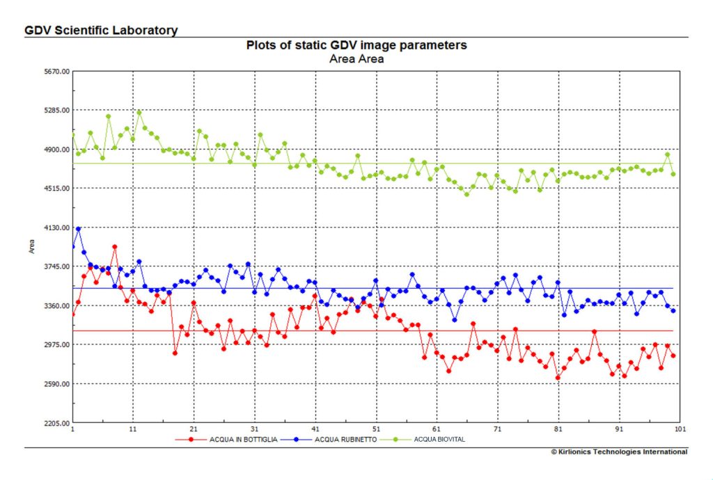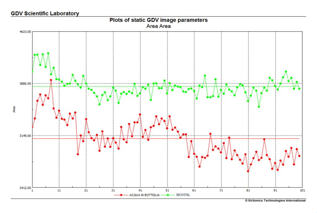 Dai grafici si può notare come l’acqua BIOVITAL sia molto più carica di energia rispetto all’acqua di rubinetto e ancor più all’acqua in bottiglia.